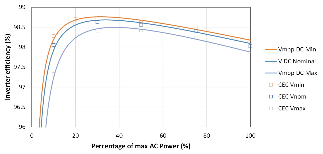 (MPPT min, MPPT max and nominal). CEC database measurements are shown as